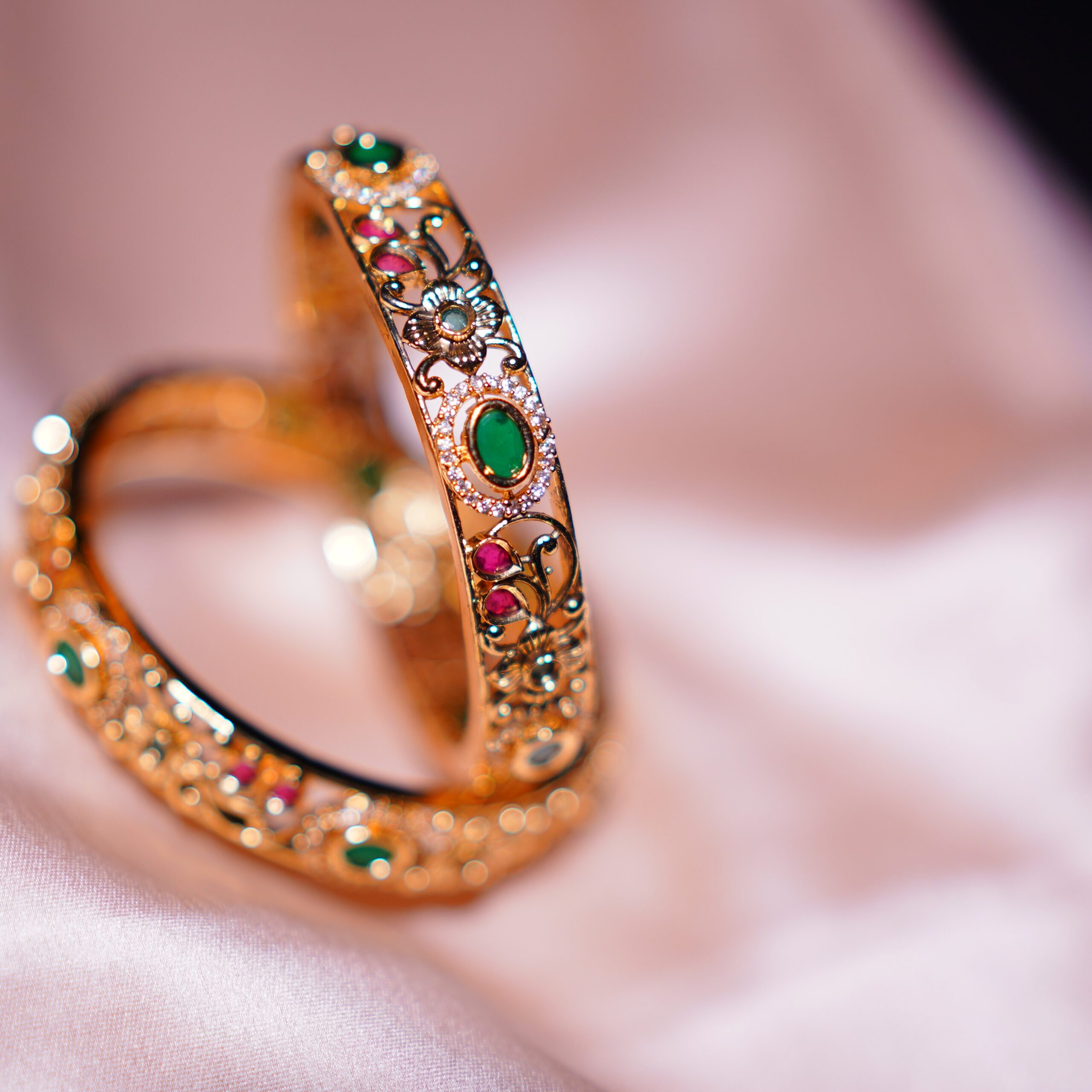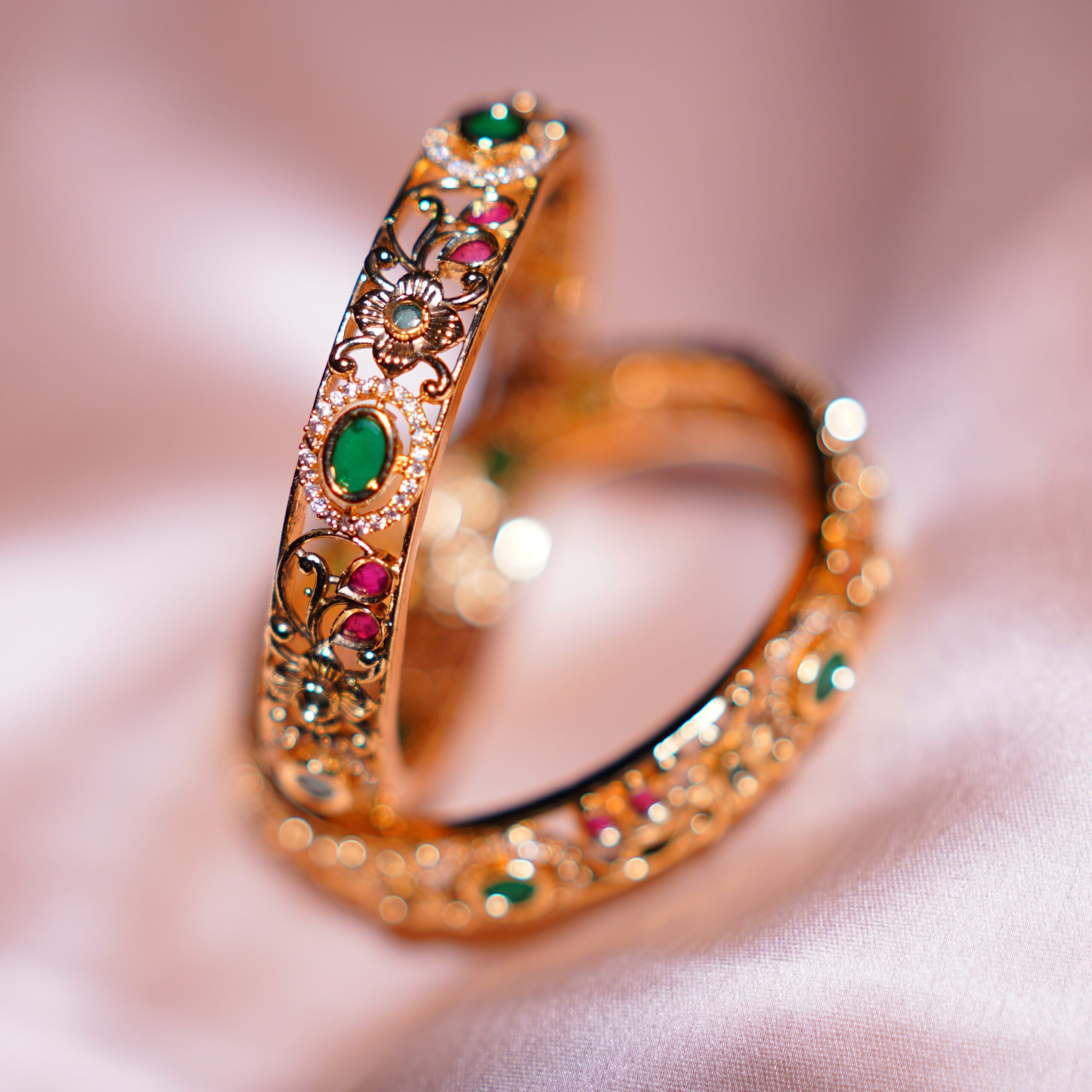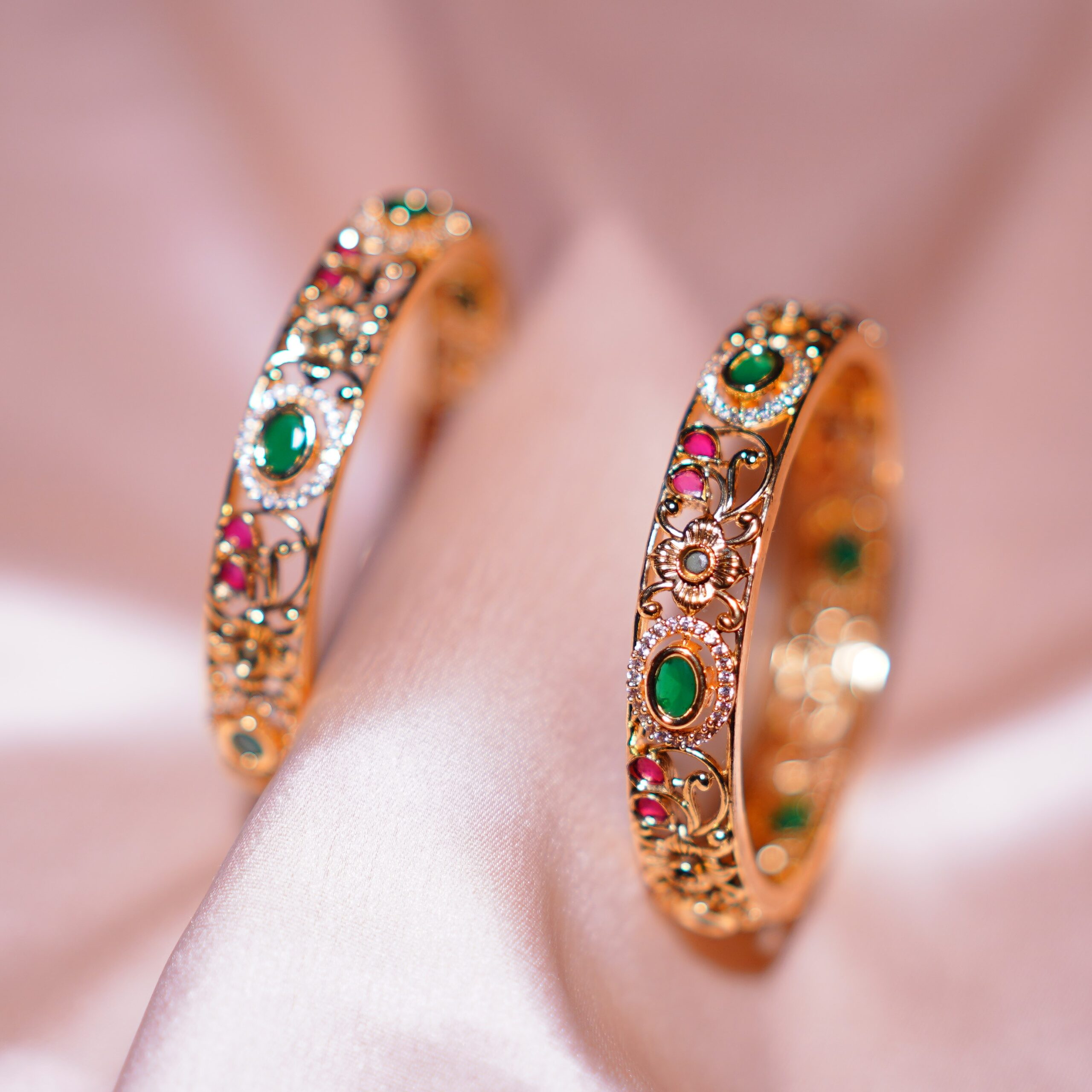 The detailed floral design reflects heritage-inspired craftsmanship. Deep green stones add a regal and festive charm. These antique green bangles are ideal for weddings, festivals, and family functions. The antique polish enhances their richness and makes them stand out effortlessly.