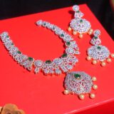 Dual Toned  necklace set features stunning Emerald Green Centre AD stones and cubic zirconia, paired with matching earrings for an elegant and luxurious statement