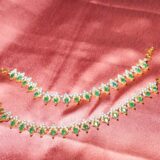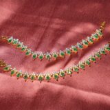 IZZVA’s Dual Toned American Diamond Cubic Zirconia Necklace Set With Emerald Green Centre Stone paired with Stunning Jhumkis to steal the spot light on any occassion. This Exclusive Designer Piece adorned with pearl accents to add extra charm makes the wearer standout in the crowd.