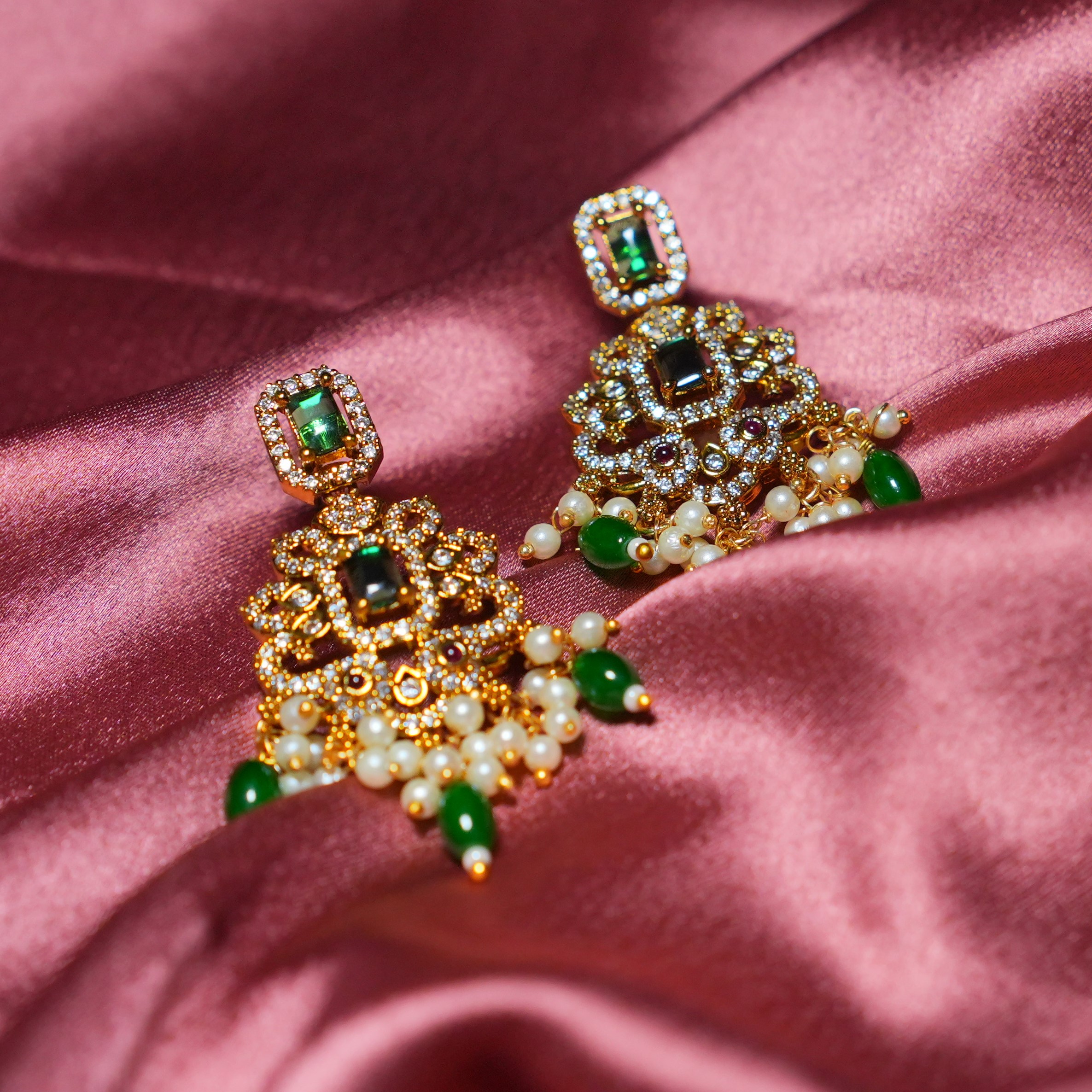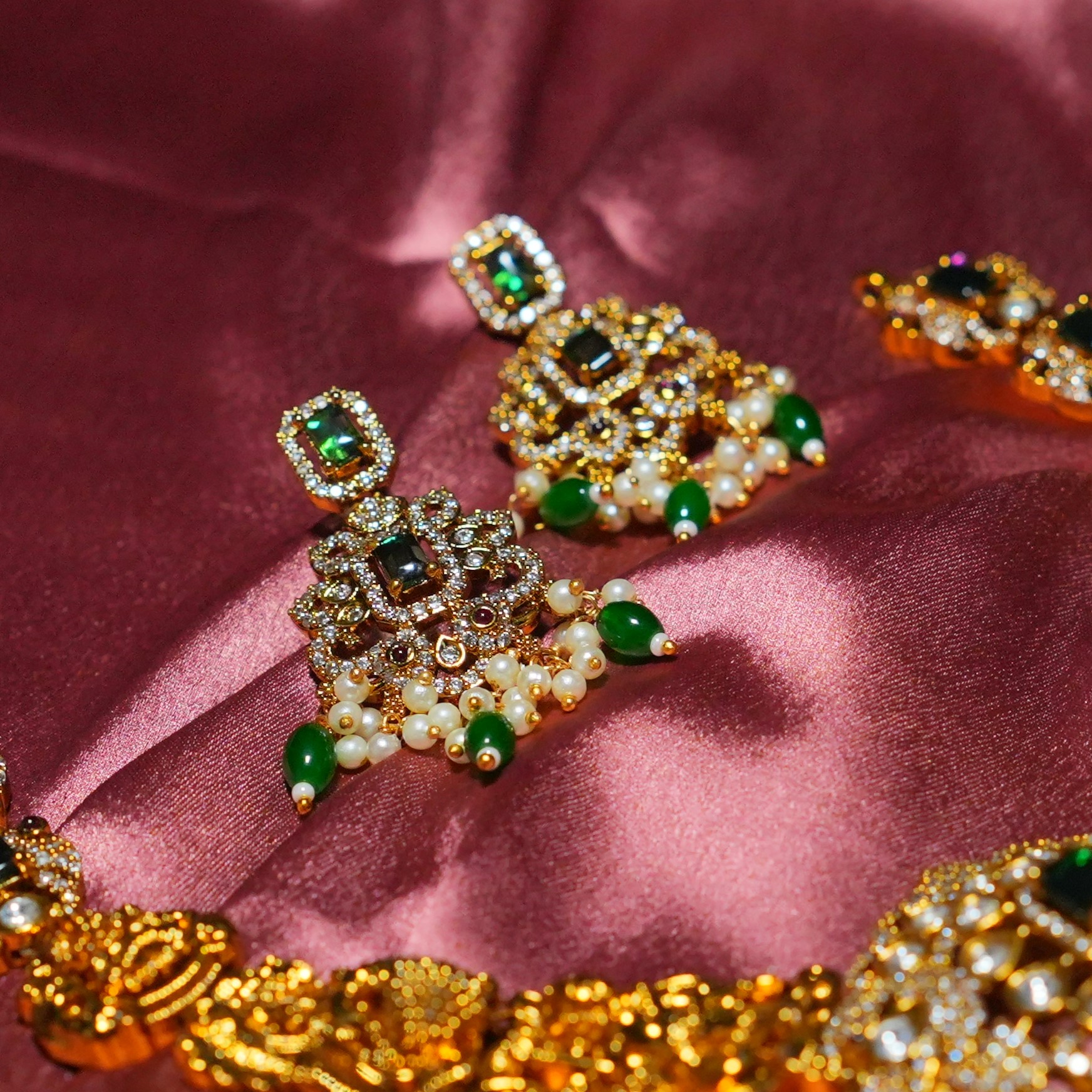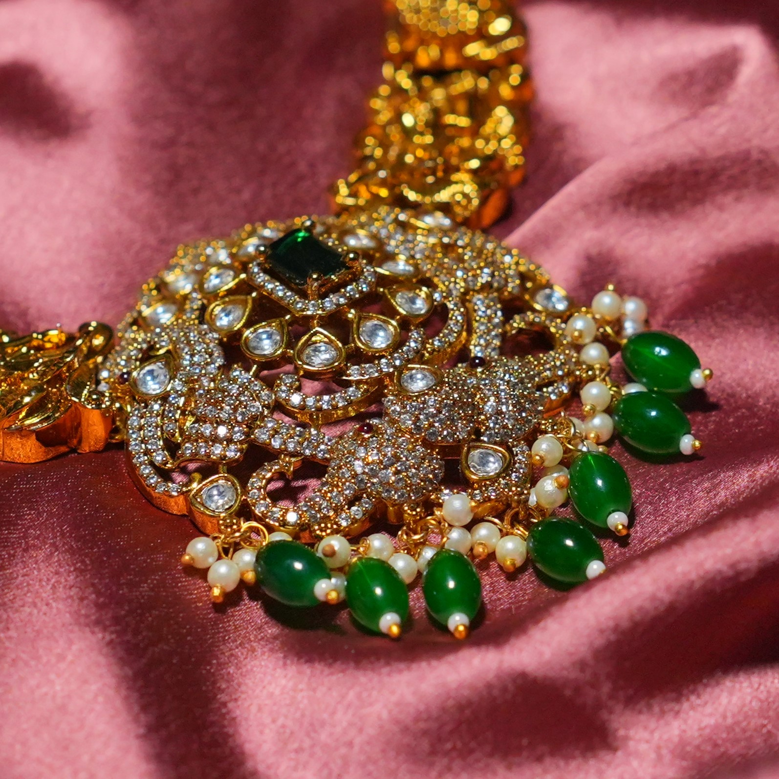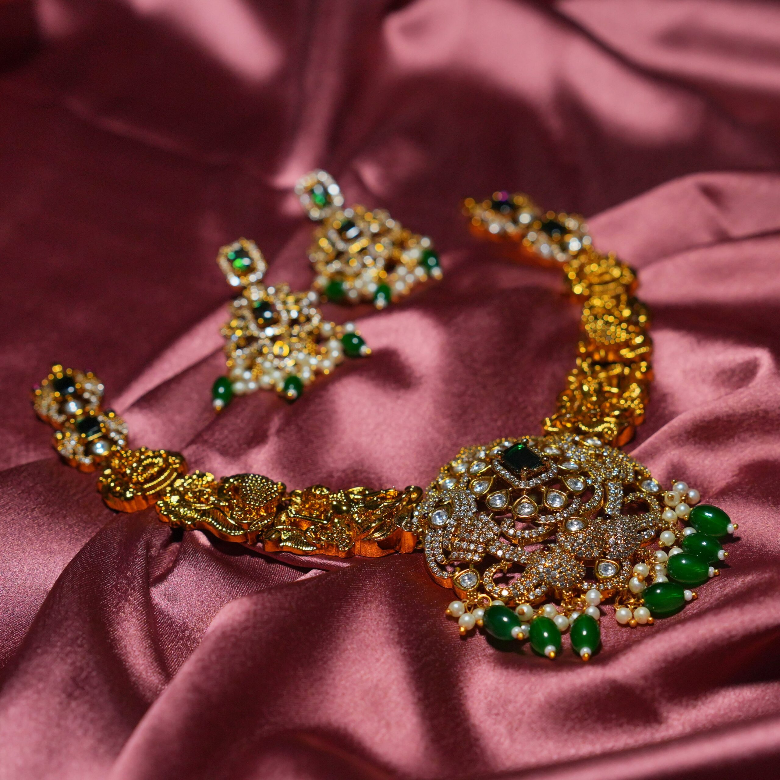 This 22K gold-plated temple jewellery set features a grand pendant with emerald green stone, with Lakshmi motif, and ghungroo detailing perfect for weddings and festive styling.