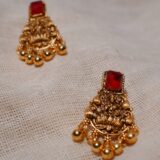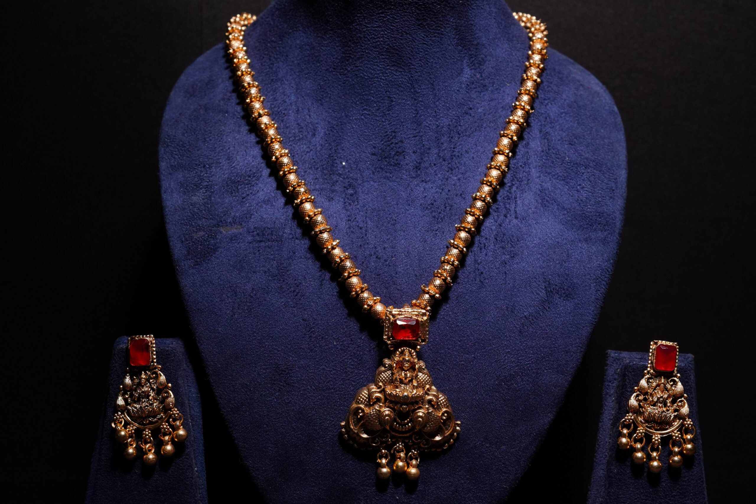 The Temple Style Gold Laxmi Necklace Set is a beautifully crafted jewellery piece inspired by traditional South Indian temple designs. Featuring a detailed Laxmi pendant, this set reflects heritage, devotion, and timeless elegance.