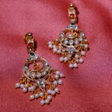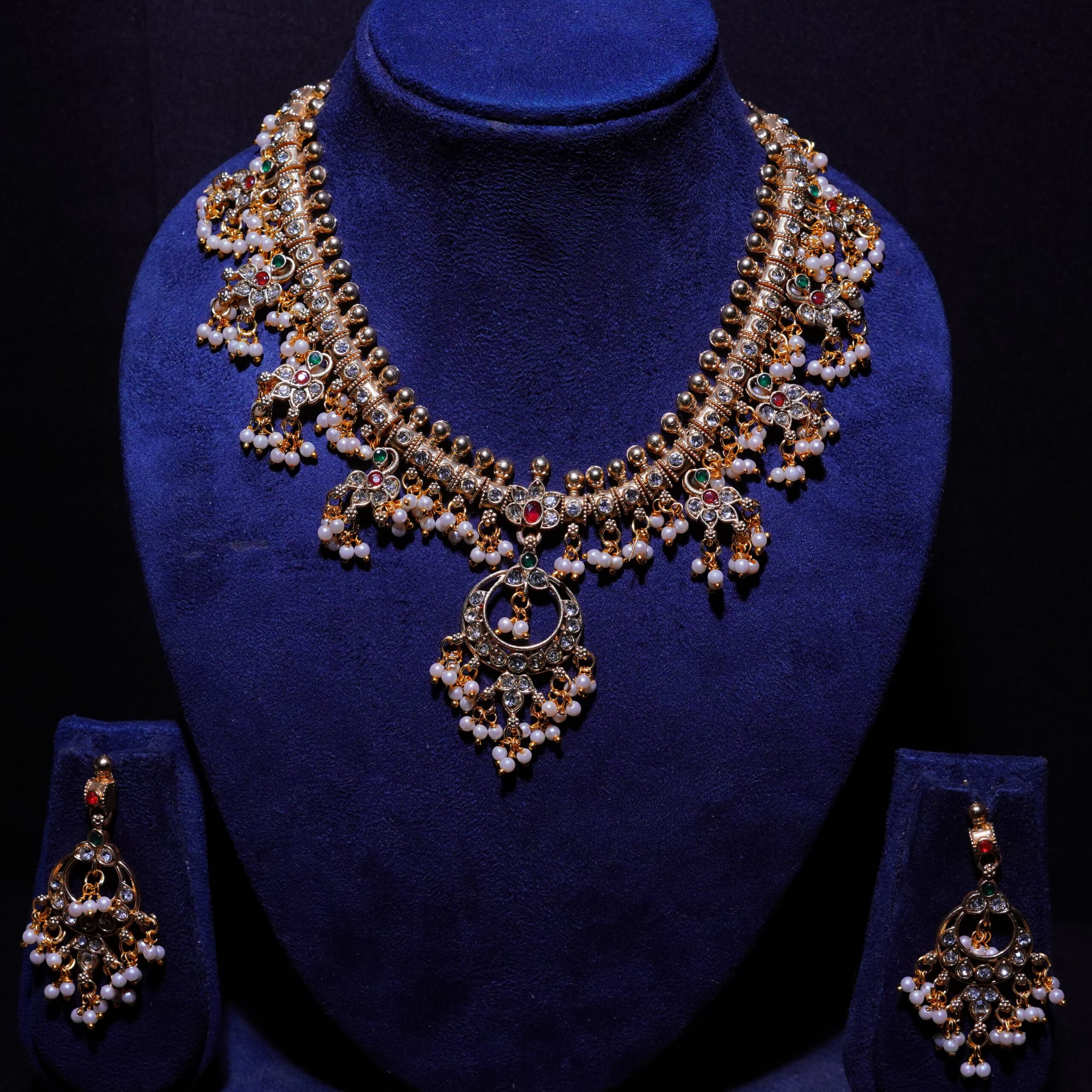 22K gold-plated necklace set with Multicolor stone detailing, white Pearl Hanging drops. Includes matching Chandbalis a bridal-ready look.