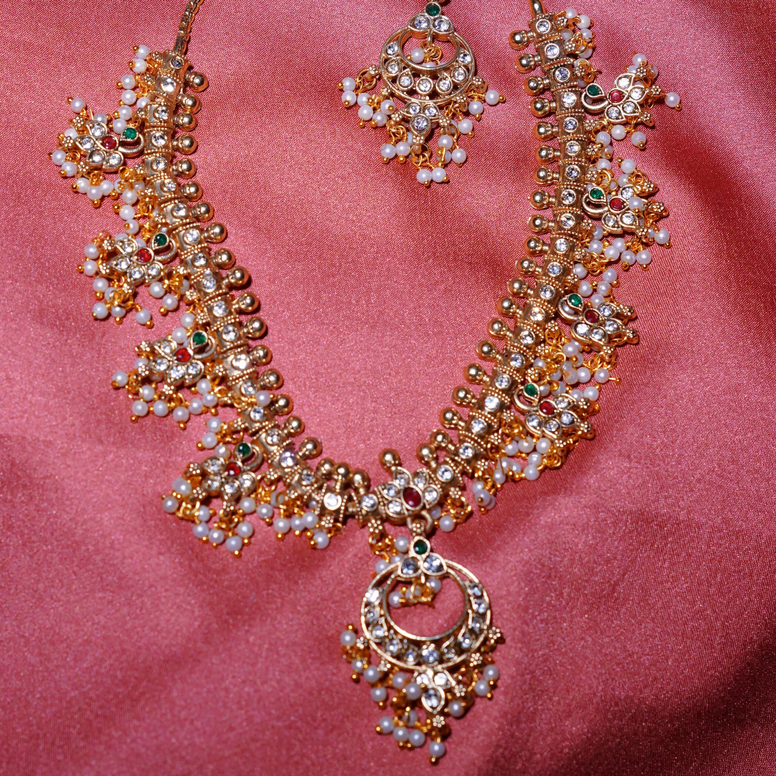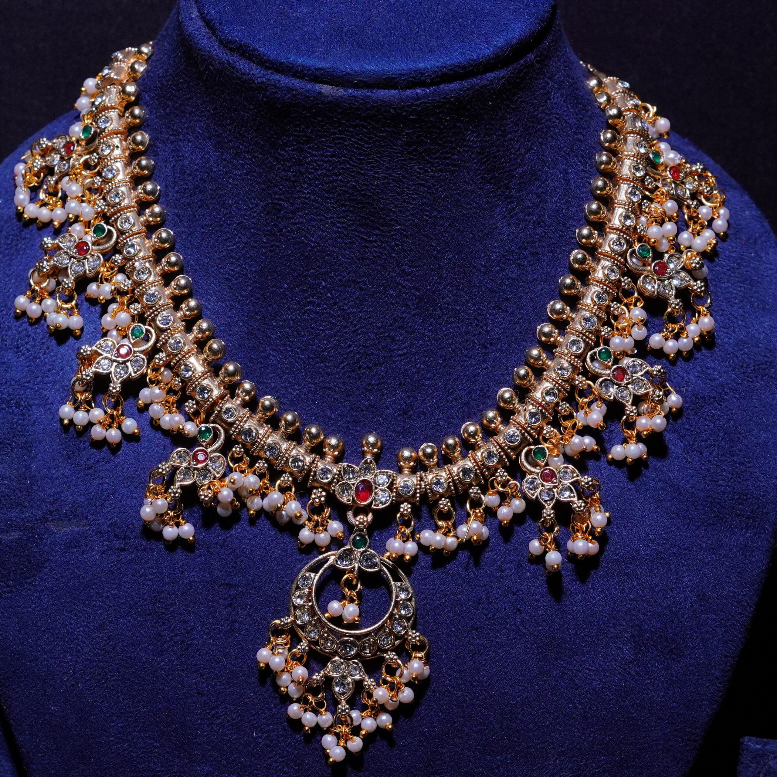 Crafted in gold plated brass with white stone detailing and pearl bead accents necklace set offers graceful traditional elegance for weddings festive occasions and bridal looks